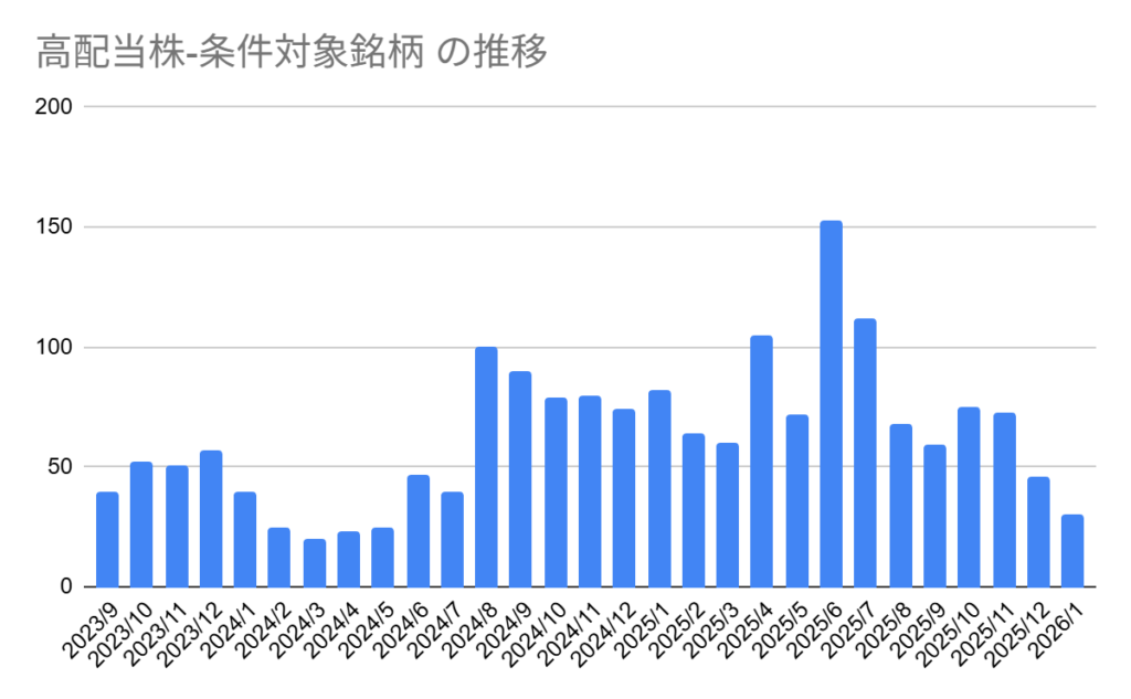 過去の傾向を見る限り、企業の本決算発表がある5月ぐらいまでは高配当株が少ない状況が続きそうです。